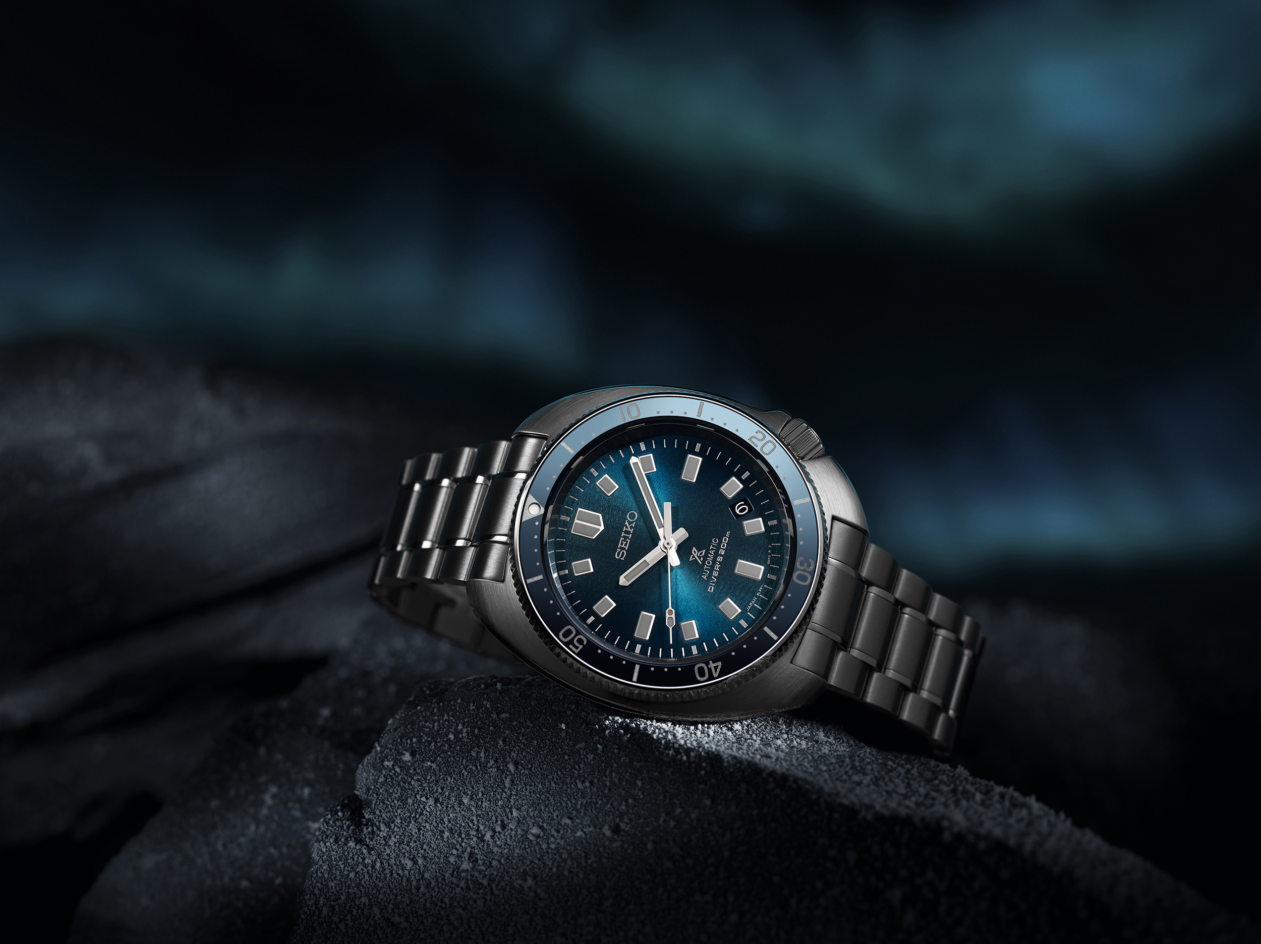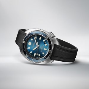The blue gradation, three-dimensional pattern on the dial and the bezel’s hard blue coated insert ring express the Aurora Borealis in the Arctic night sky and the design comes with an additional exclusively designed 1970s style silicone strap.