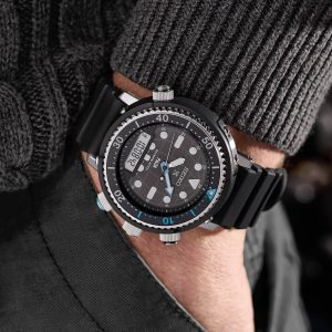 This diver’s watch is a modern re-interpretation of the Seiko “Hybrid diver’s,” a world-first originally released in 1982 as a hybrid combination of analogue and digital watch technology. This model is also known as the ‘Arnie’ after the actor who wore it in the film ‘Commando’ and its watch shape is nicknamed by Seiko fans as a ‘Tuna’ – because of its larger diameter and bold shape like a tuna tin.