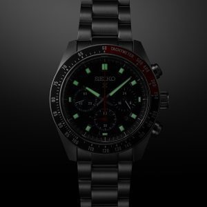 This solar-powered chronograph timepiece is from the Prospex Speedtimer watch collection which represents Seiko’s professional timekeeping heritage.