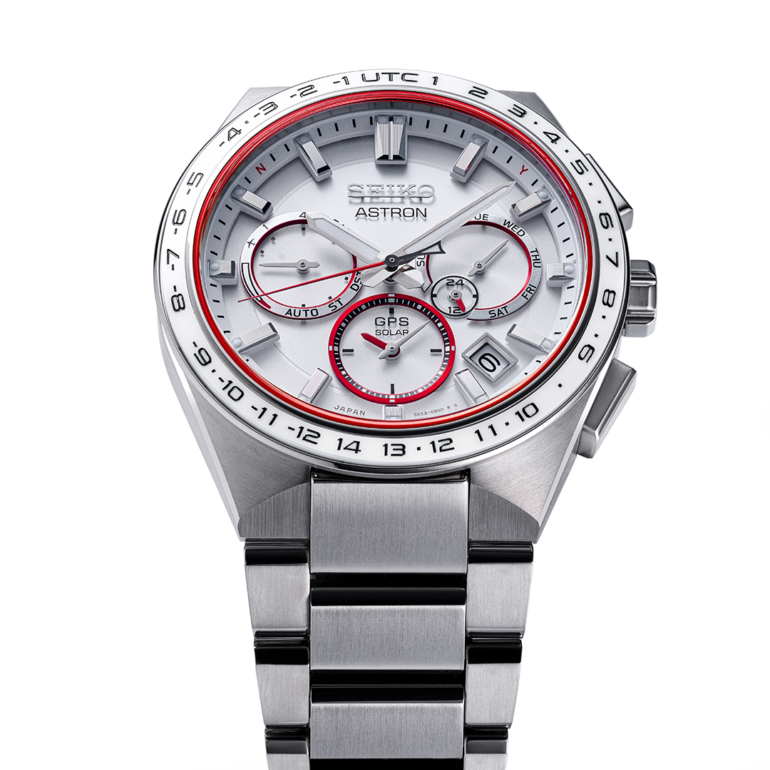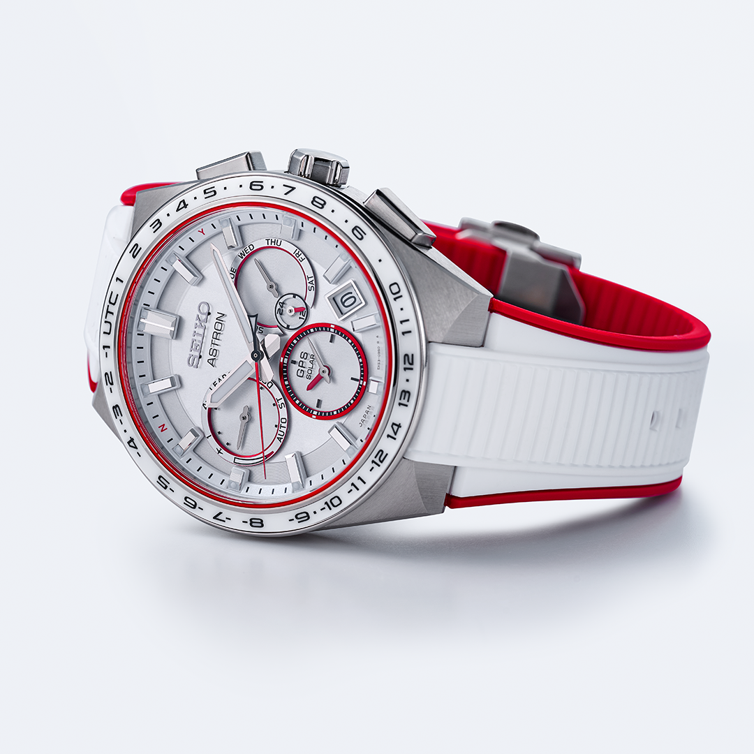 The watch has a modern style thanks to its sleek and slim profile – it features the signature red colour of Médecins Sans Frontières, whilst its scratch-proof white ceramic bezel panel is built for style and durability. “In Support of Médecins Sans Frontières” on the caseback expresses the partnership and this watch is accompanied by both a bracelet as well as a white and red combination silicone strap, a first for Astron.
