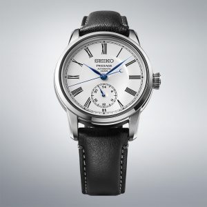 Under a dual-curve sapphire crystal glass is a white enamel dial, lined with a ‘railtrack’ design around its circumference, accented by roman numerals – inspired by the original Seikosha pocket watch. From a distance, the slim and stylish nostalgic numerals seem like baton indices, increasing legibility even further whilst the stainless steel case of this craftsmanship piece is finished with a super-hard coating for increased scratch resistance.