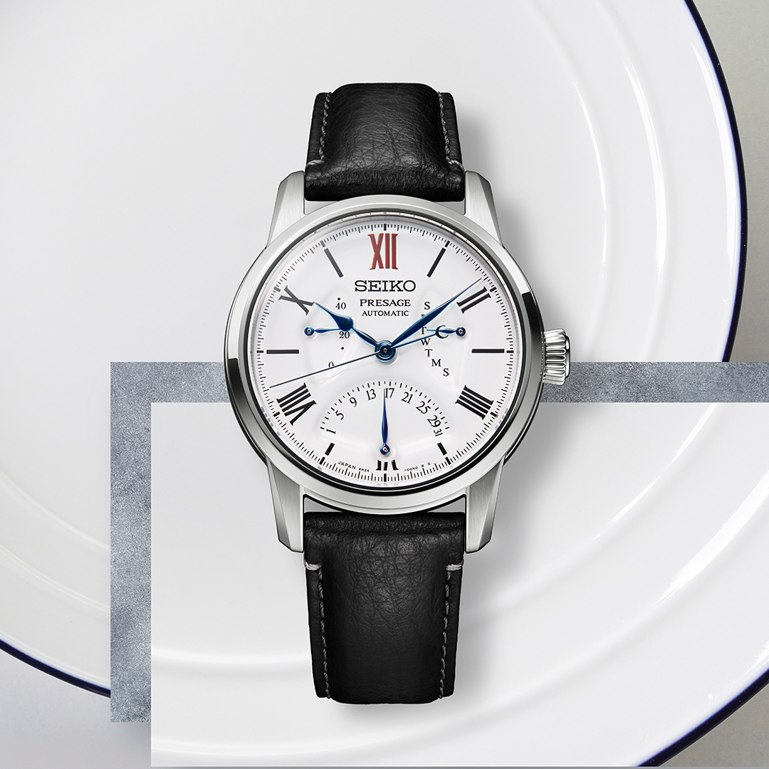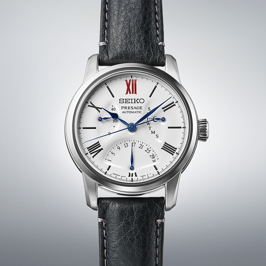 The enamel watch dial is inspired by the material from the 1913 original, which was a classic piece featuring an enamelled dial with a signature ‘red twelve’ marker at 12 o’clock – a design element still seen on many Seiko watches today.